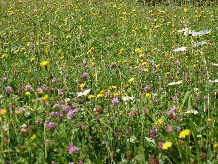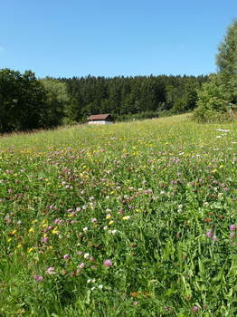 Kunterbunt präsentiert sich die Wiese gleich oberhalb des Hotelparks. Hier wachsen nicht nur verschiedene Gräser, sondern auch viele Blumen und Wildkräuter. Der erste Schnitt ist übrigens der Beste. Unsere Therapeuten verwenden diesen für die Wiesen- und Heublumenpackung in der Wellnessabteilung. Durch Erwärmung entfaltet das duftende Heu seine Wirkstoffe und sorgt für optimale Entschlackung. Giftstoffe werden abtransportiert. Übrigens ist es auch bei rheumatischen Beschwerden hilfreich.