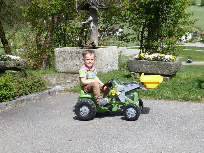 Mein Name ist Ludwig und ich bin schon fast 3 Jahre alt. Meine Arbeitswelt im Reinerhof ist sehr abwechslungsreich. Am liebsten arbeite ich mit meinem Bulldog auf dem Parkplatz und im Garten und schaue nach, dass überall ausreichend Erde und Rindenmulch verteilt ist.